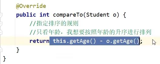 @Overridepublic int compareTo(Student o) {int sum1 = this.getChinese() + this.getMath() + this.getEnglish();int sum2 = o.getChinese() + o.getMath() + this.getEnglish();int i = sum1 - sum2;i = i == 0 ? this.chinese - o.getChinese() : i;i = i == 0 ? this.getMath() - o.getMath() : i;i = i == 0 ? this.getEnglish() - o.getEnglish() : i;i = i == 0 ? this.getAge() - o.getAge() : i;i = i == 0 ? this.getName().compareTo(o.getName()):i;return i;}