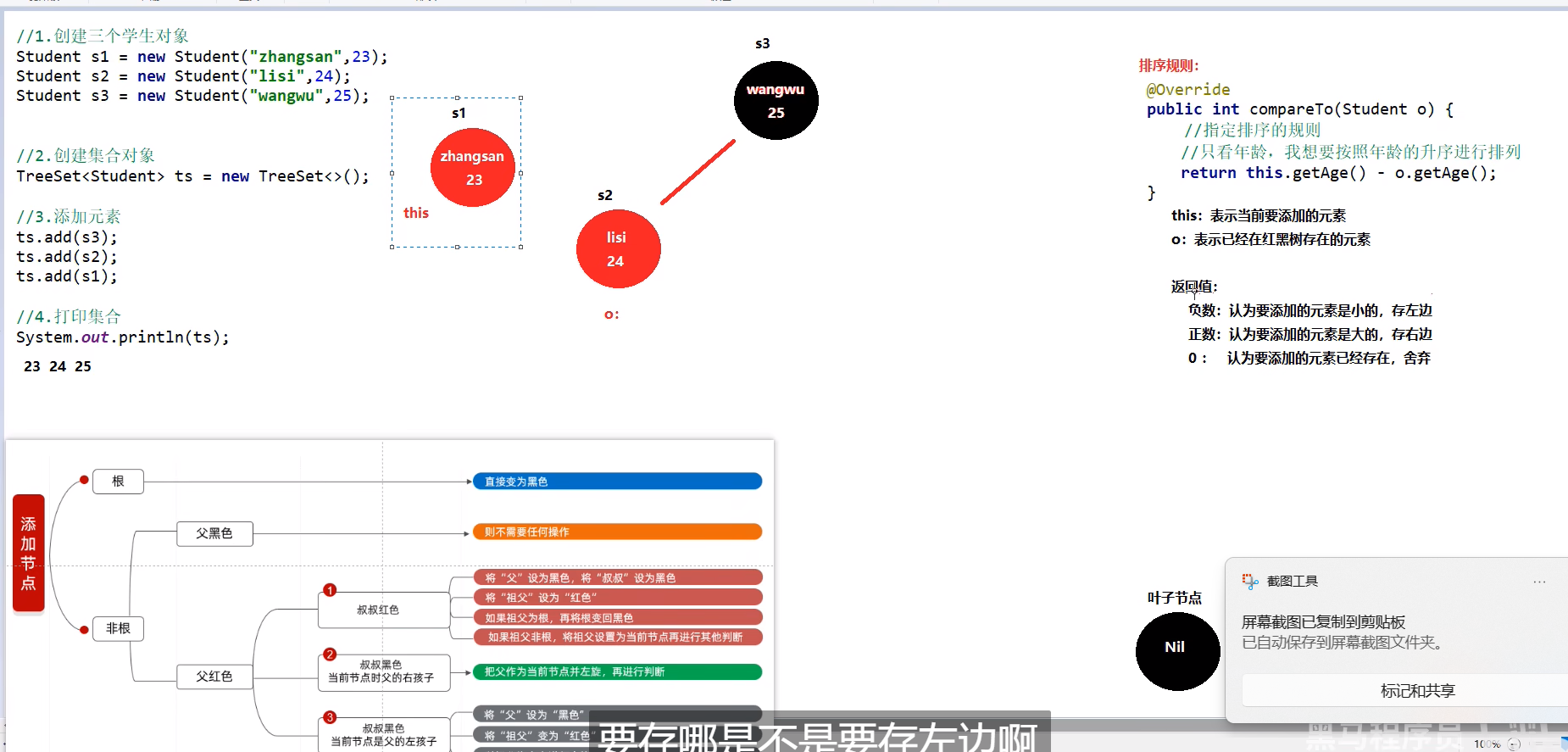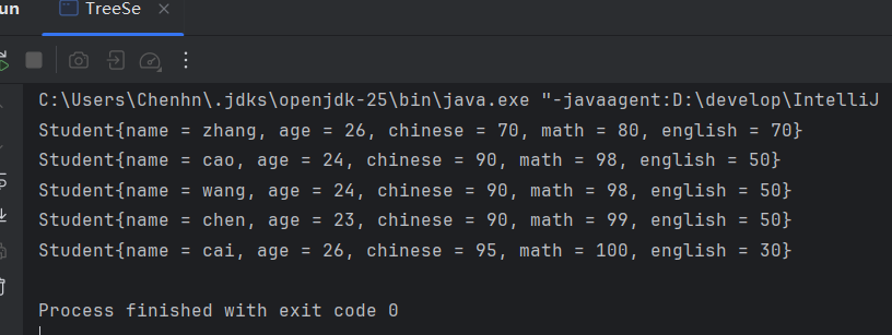 import java.util.TreeSet;public class TreeSe {static void main() {Student s1 = new Student("chen",23,90,99,50);Student s2 = new Student("wang",24,90,98,50);Student s3 = new Student("cao",24,90,98,50);Student s4 = new Student("cai",26,95,100,30);Student s5 = new Student("zhang",26,70,80,70);//2.TreeSet<Student> ts = new TreeSet<Student>();ts.add(s1);ts.add(s2);ts.add(s3);ts.add(s4);ts.add(s5);for (Student t : ts) {System.out.println(t);}}