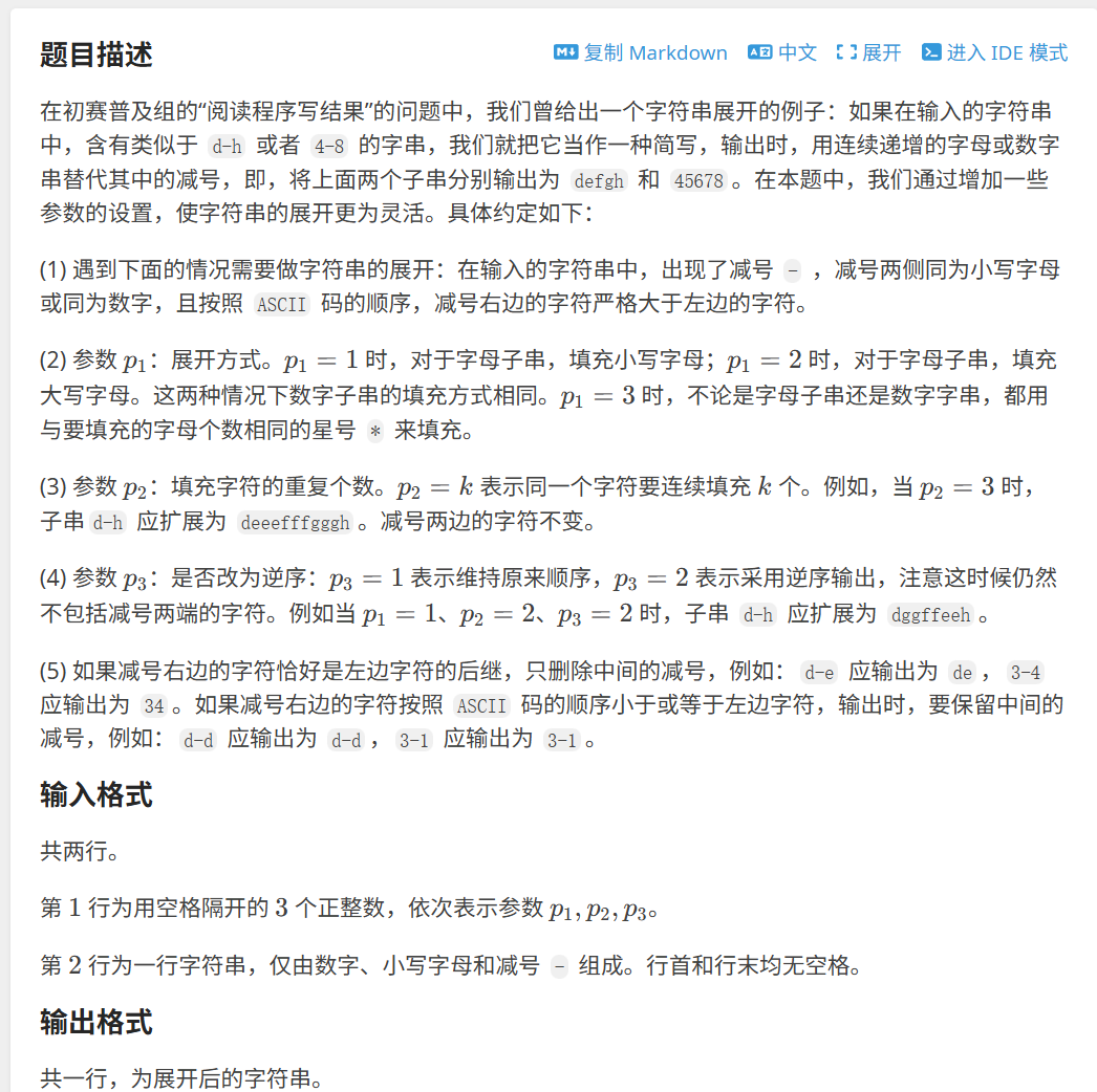 {cin>>p1>>p2>>p3>>a;int n = a.size();for(int i=0;i<=n-1;i++){//不是 - 号,或者 - 号出现在开头和结尾if(a[i]!='-'||i==0||i==n-1) ret+=a[i];else{char left=a[i-1],right=a[i+1];//islet函数为判断字符是否为字母,isnum函数为判断字符是否为数字 if((islet(left)&&islet(right)&&right>left)||(isnum(left)&&isnum(right)&&right>left)){//字符串展开add(left,right); }else{ret+=a[i];}}}cout<<ret;return 0;