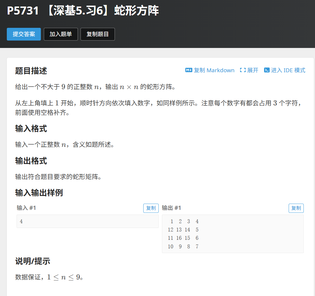 {int n;cin>>n;int x=1,y=1;//初始位置int count=1;//当前数值 int pos = 0;while(count<=n*n){//正常情况 if(y >= 1 && y <= n && x <= n && x >= 1 && ret[x][y] == 0) ret[x][y]=count;else//越界情况 {x-=dx[pos];y-=dy[pos];//出现越界了还要退回到原来位置 pos = (pos+1)%4; count--;//字符还没有填,所以需要和后面那个count++抵消掉 } x+=dx[pos];y+=dy[pos];count++;}for(int i=1;i<=n;i++){for(int j=1;j<=n;j++)printf("%3d",ret[i][j]); cout<<endl;}return 0;