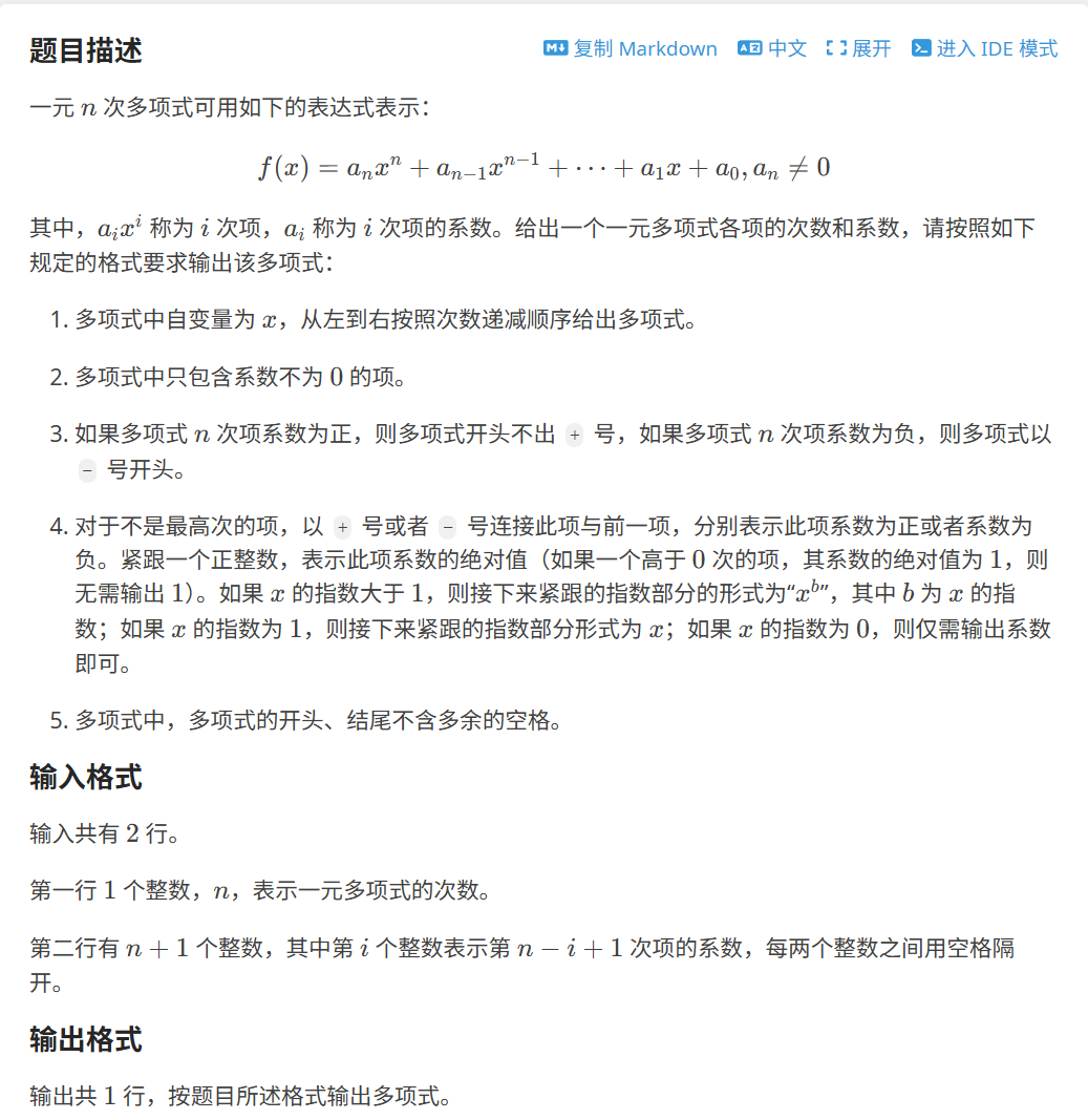 {int n;cin>>n;vector<int> num(n+1,0);for(int i=n;i>=0;i--)cin>>num[i];for(int i=n;i>=0;i--){//系数为0,什么都不用考虑了 if(!num[i]) continue;else{//符号判断 if(num[i]<0) ret+='-';else{if(i!=n) ret+='+';}//系数判断int flag = abs(num[i]);if(flag!=1||(flag==1&&i==0)) ret+=to_string(flag);//次数判断if(i>1) ret = ret + "x^" + to_string(i);else if(i==1) ret += "x";} }cout<<ret;return 0;