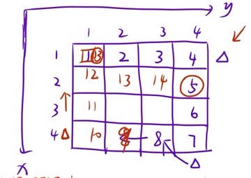 - 根据规则结合方向向量填数:朝一个方向走,边走边填数;越界之后,结合方向向量,重新计算出新的坐标以及方向