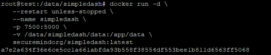 docker run -d \--restart unless-stopped \--name simpledash \-p 7500:5000 \-v /data/simpledash/data:/app/data \securemindorg/simpledash:latest