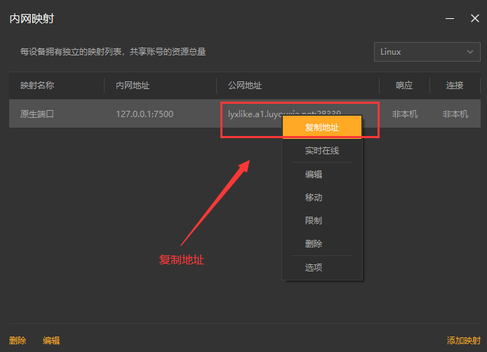 10,创建好后,就可以看到一条映射的公网地址,鼠标右键点击【复制地址】。