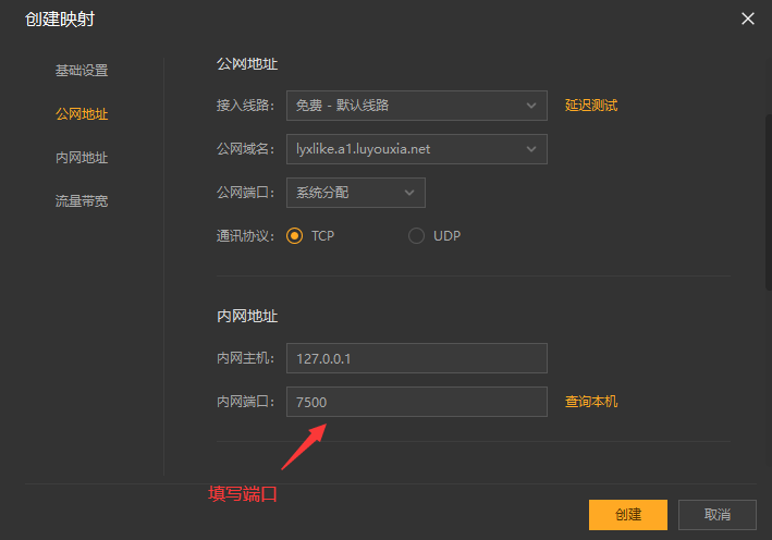 9,在内网端口里填写端口 7500 后点击【创建】按钮,如下图。