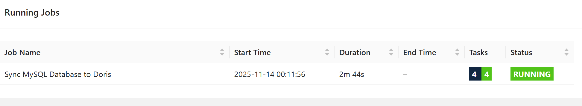 ph@mydoris:/opt/module/flink-cdc-3.0.0/yaml$ /opt/module/flink-cdc-3.0.0/bin/flink-cdc.sh mysql-to-doris.yaml Pipeline has been submitted to cluster. Job ID: daf31e7e87299e00dcd398ae217874d8 Job Description: Sync MySQL Database to Doris
