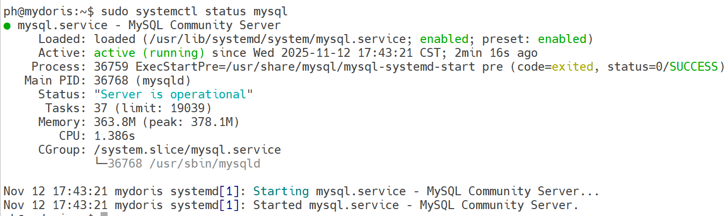 # 更新软件包列表 sudo apt update # 查看可使用的安装包 sudo apt search mysql-server # 安装最新版本 sudo apt install -y mysql-server # 安装指定版本: sudo apt install -y mysql-server-8.0 - 检查MySQL状态