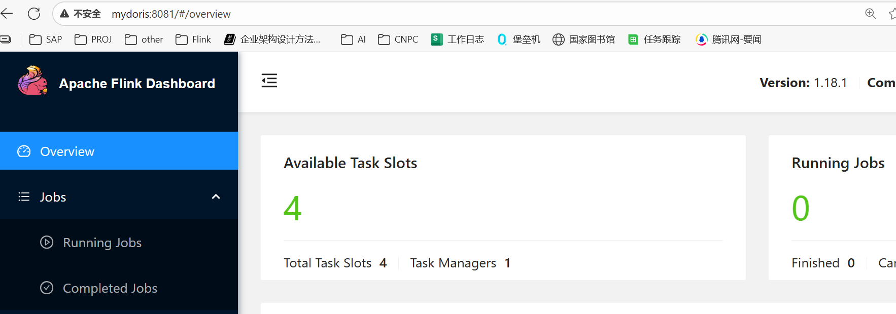 vim $FLINK_HOME/conf/flink-conf.yaml # flink web ui 可在外部访问 rest.bind-address: 0.0.0.0 rest.address: mydoris # 设置taskmanager有4个作业Slot taskmanager.numberOfTaskSlots: 4 - 启动集群:$FLINK_HOME/bin/start-cluster.sh