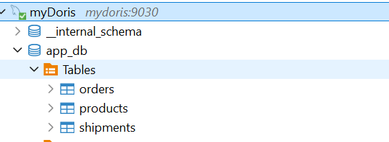 -- 创建数据库 CREATE DATABASE app_db;USE app_db;-- 创建 orders 表 CREATE TABLE `orders` ( `id` INT NOT NULL, `price` DECIMAL(10,2) NOT NULL, PRIMARY KEY (`id`) );-- 插入数据 INSERT INTO `orders` (`id`, `price`) VALUES (1, 4.00); INSERT INTO `orders` (`id`, `price`) VALUES (2, 100.00);-- 创建 shipments 表 CREATE TABLE `shipments` ( `id` INT NOT NULL, `city` VARCHAR(255) NOT NULL, PRIMARY KEY (`id`) );-- 插入数据 INSERT INTO `shipments` (`id`, `city`) VALUES (1, 'beijing'); INSERT INTO `shipments` (`id`, `city`) VALUES (2, 'xian');-- 创建 products 表 CREATE TABLE `products` ( `id` INT NOT NULL, `product` VARCHAR(255) NOT NULL, PRIMARY KEY (`id`) );-- 插入数据 INSERT INTO `products` (`id`, `product`) VALUES (1, 'Beer'); INSERT INTO `products` (`id`, `product`) VALUES (2, 'Cap'); INSERT INTO `products` (`id`, `product`) VALUES (3, 'Peanut'); - 在doris中创建数据库