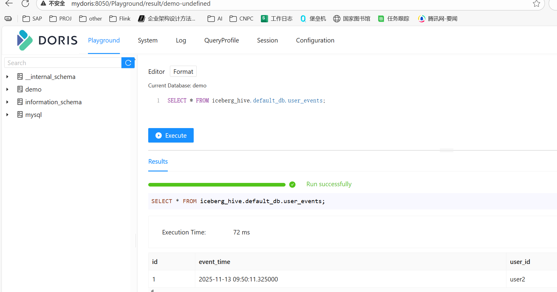 -- 查看 Catalog SHOW CATALOGS; -- 切换 catalog SWITCH iceberg_hive; -- 查看 database SHOW DATABASES; -- 切换 database USE default_db; -- 查看表 show tables; -- 查看数据 SELECT * FROM iceberg_hive.default_db.user_events;