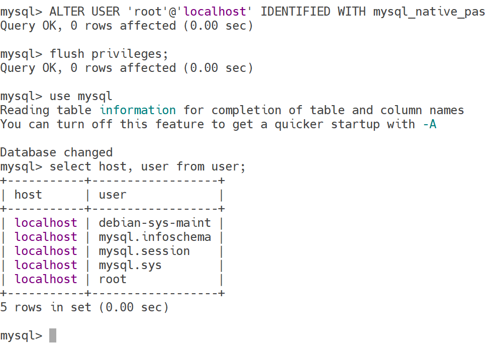 sudo mysql -u root -p - 设置密码:ALTER USER 'root'@'localhost' IDENTIFIED WITH mysql_native_password BY 'Admin1234';