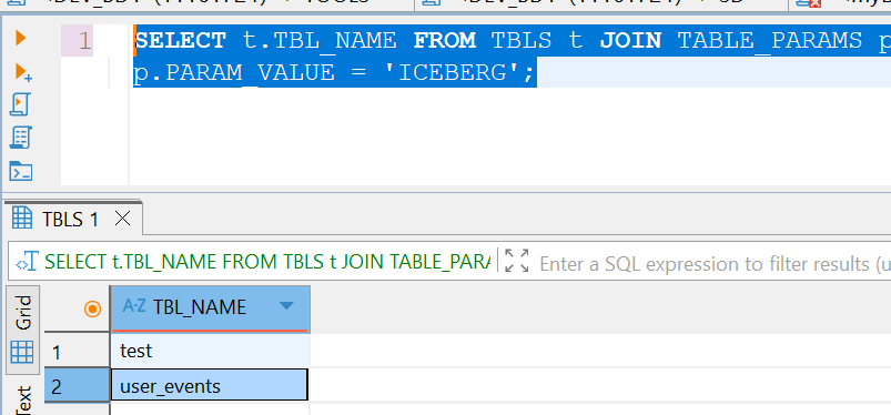 SELECT t.TBL_NAME FROM TBLS t JOIN TABLE_PARAMS p ON t.TBL_ID = p.TBL_ID WHERE p.PARAM_KEY = 'table_type' AND p.PARAM_VALUE = 'ICEBERG';