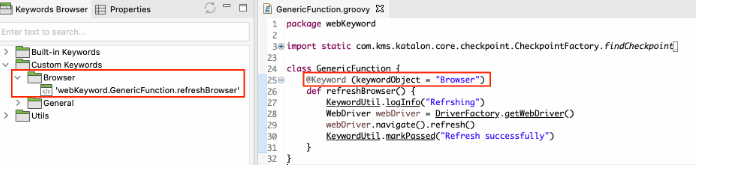 应始终通过keywordObject为自定义关键字声明类别。这样,Katalon Studio会在关键字浏览器中为关键字创建单独的文件夹。