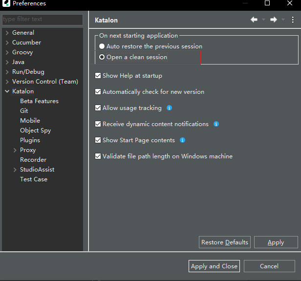 当设置为在下次启动应用程序时自动恢复上一个会话时,启动Katalon Studio需要更多时间。为减少启动时间,可以转到 Katalon Studio > Preferences > Katalon,选择“打开清洁会话”,然后单击“应用并关闭”。