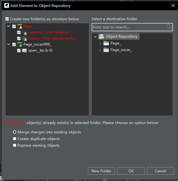 首次使用录制功能时,可以按照显示的默认配置保存所有对象。再次录制测试时,应先选择模块文件夹,这样录制器会显示所有重复对象,此时应选择“合并到现有对象”选项保存。