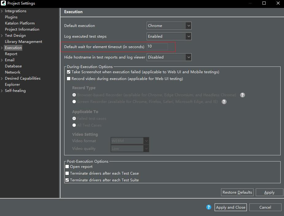 默认情况下,调用自我修复功能最多可能需要30秒。此延迟由“默认元素等待超时”设置控制。为减少等待时间,可以转到 Project > Settings > Execution,然后将“默认元素等待超时”设置为较小的数字(例如5秒)。