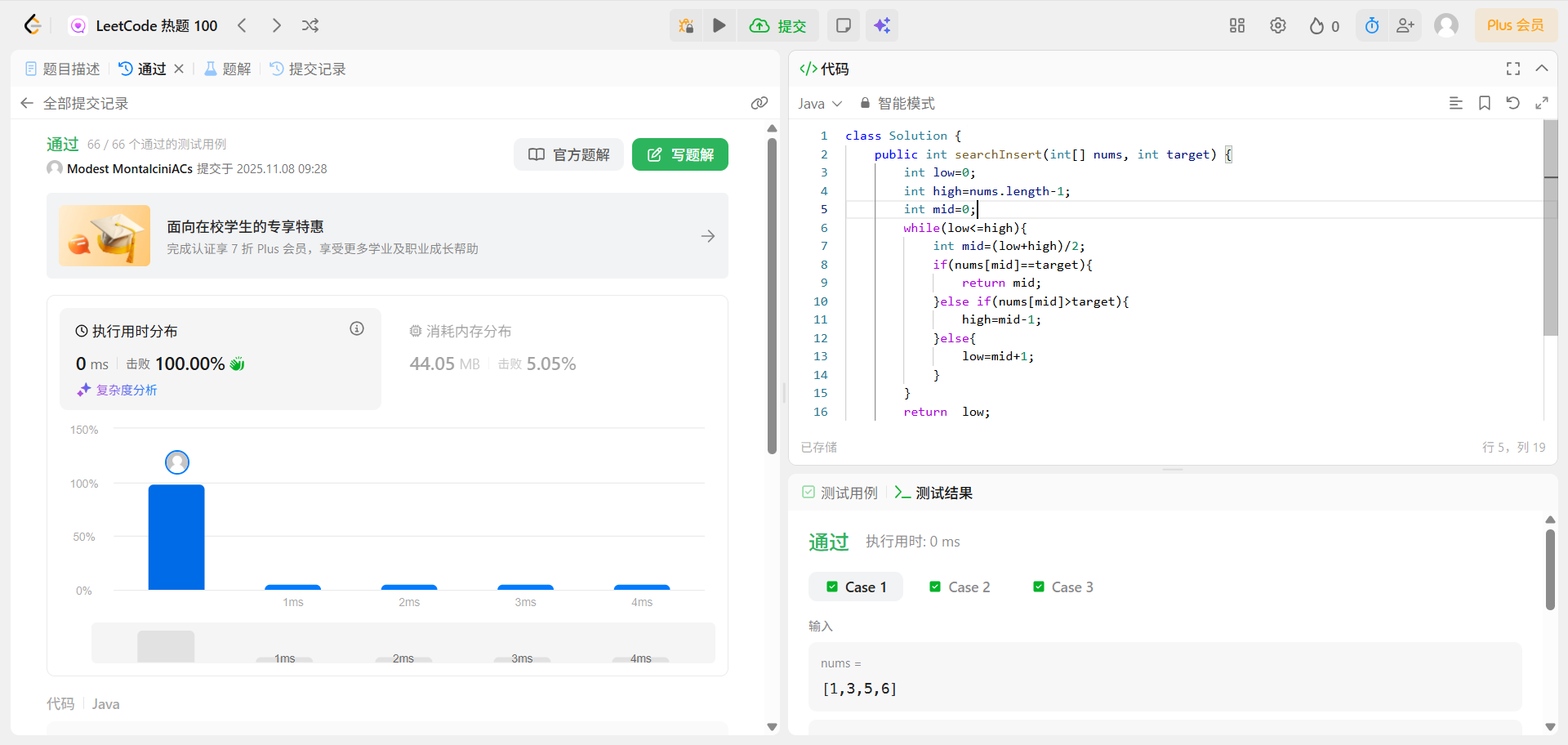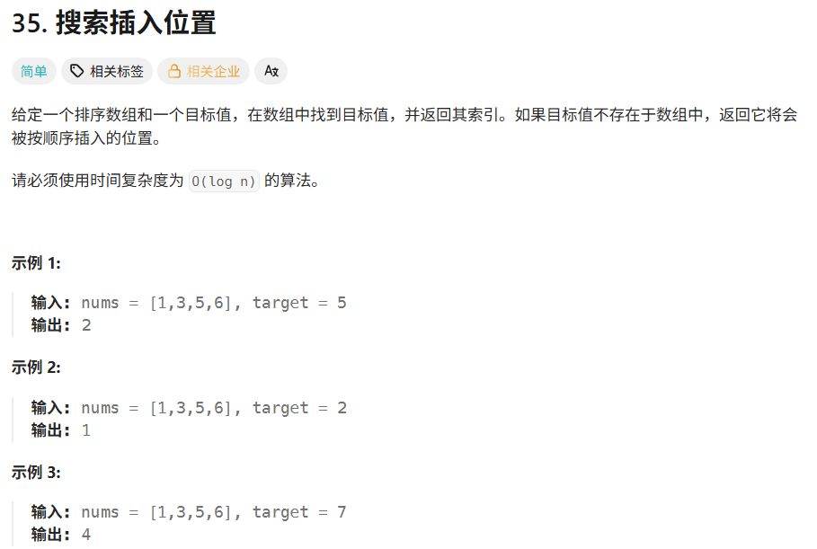 class Solution {public int searchInsert(int[] nums, int target) {int low=0;int high=nums.length-1;int mid=0;while(low<=high){mid=(low+high)/2;if(nums[mid]==target){return mid;}else if(nums[mid]>target){high=mid-1;}else{low=mid+1;}}return low;}