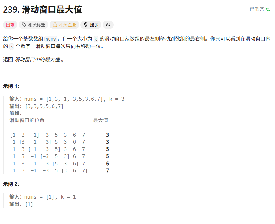 class Solution {public int[] maxSlidingWindow(int[] nums, int k) {int n=nums.length;int[]result=new int[n-k+1];int min=0;for(int i=0;i<n;i++){if(nums[i]<min)min=nums[i];}int fmax=min;int poi=0;for(int j=0;j<k;j++){if(nums[j]>fmax){fmax=nums[j];poi=j;}}result[0]=fmax;int max=fmax;for(int i=1;i<n-k+1;i++){if(poi>i-1&&poi<i+k-1){if(nums[i+k-1]>max){max=nums[i+k-1];poi=i+k-1;}result[i]=max;}else{max=min;for(int j=i;j<i+k;j++){if(nums[j]>max){max=nums[j];poi=j;}result[i]=max;}}}return result;}