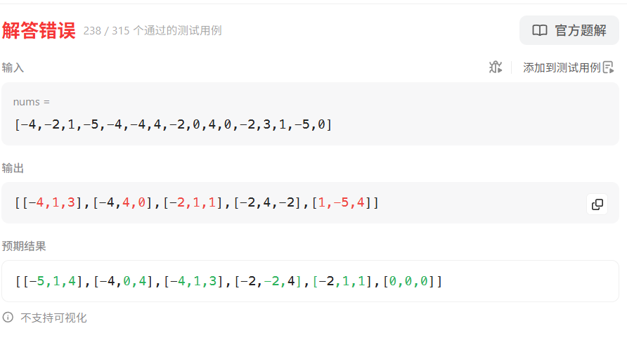 我在验证新加入的元素是否在集合中已经存在重复的时候,选择使用HashSet的方式,因为哈希表找到元素的时间复杂度最低,但是这是没有必要的,因为我们要验证的只有三个数字,要是数目特别多的话倒是可以考虑这个方法,当然还要再改进一下。我的这个验证的方法,在这里是行不通的,完全行不通的。比如例子中,全零,因为在前面的[-4,0,4]中存在0。所以后面全零,直接就无法通过,肯定是有很多例子都无法通过的。