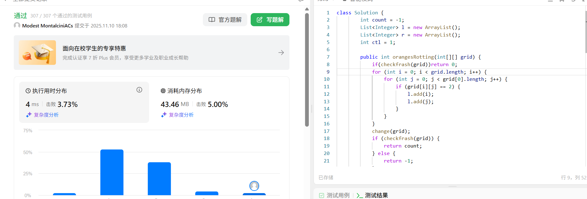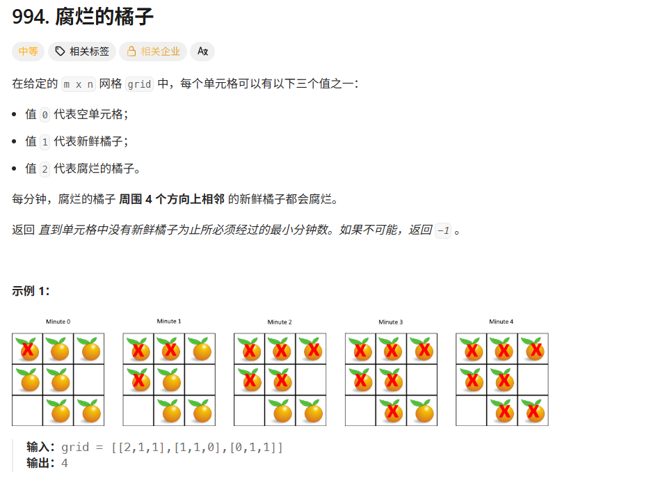 一旦找到一个腐烂橘子,立即调用 change扩散腐烂,扩散完检查是否还有新鲜橘子,如果没有就返回分钟数。