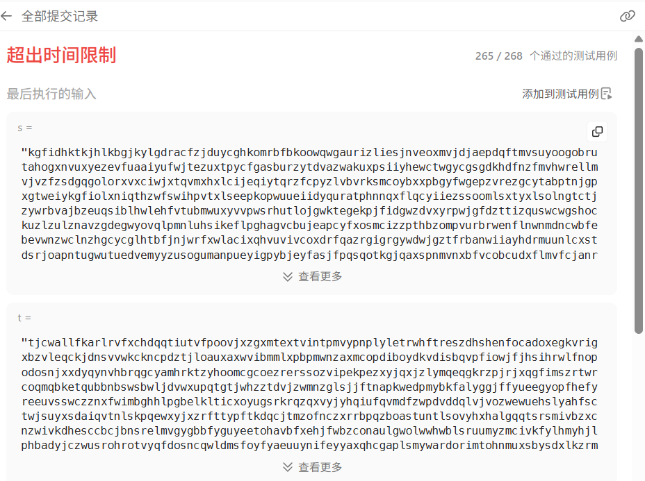 经过两分钟思考,我想到了为什么还是报同样的错,我的这个方法在这个错误上没有用处,这个报错的例子t很长,一定是包含了所有的52的大小写字母的,所以我的pass会一直是0。所以我的方法确实被优化了,但是对t很大的情况,是没用的。