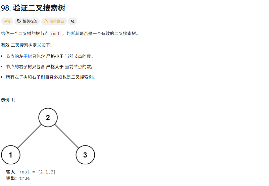 class Solution {boolean flag=true;public boolean isValidBST(TreeNode root) {check(root);return flag;}public boolean check(TreeNode p){if(p==null)return true;check(p.left);check(p.right);if(p.left!=null&&p.val<=p.left.val||p.right!=null&&p.val>=p.right.val){flag=false;return false;}return true;}