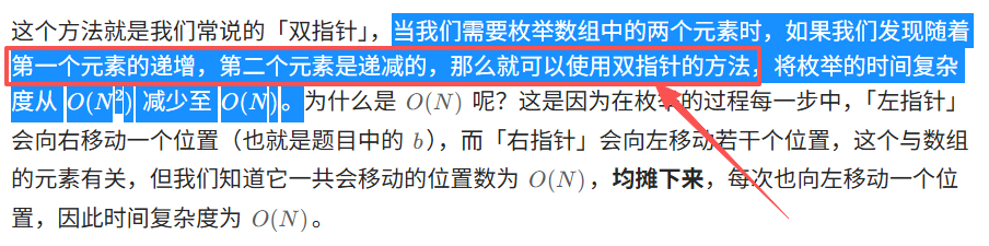 这道题目用到双指针的方法,双指针的思想会使得算法的时间复杂度降一个档次,为了确保我真的理解了这个算法,我专门和题解里的代码写的不一样(但是思想是一样的)。