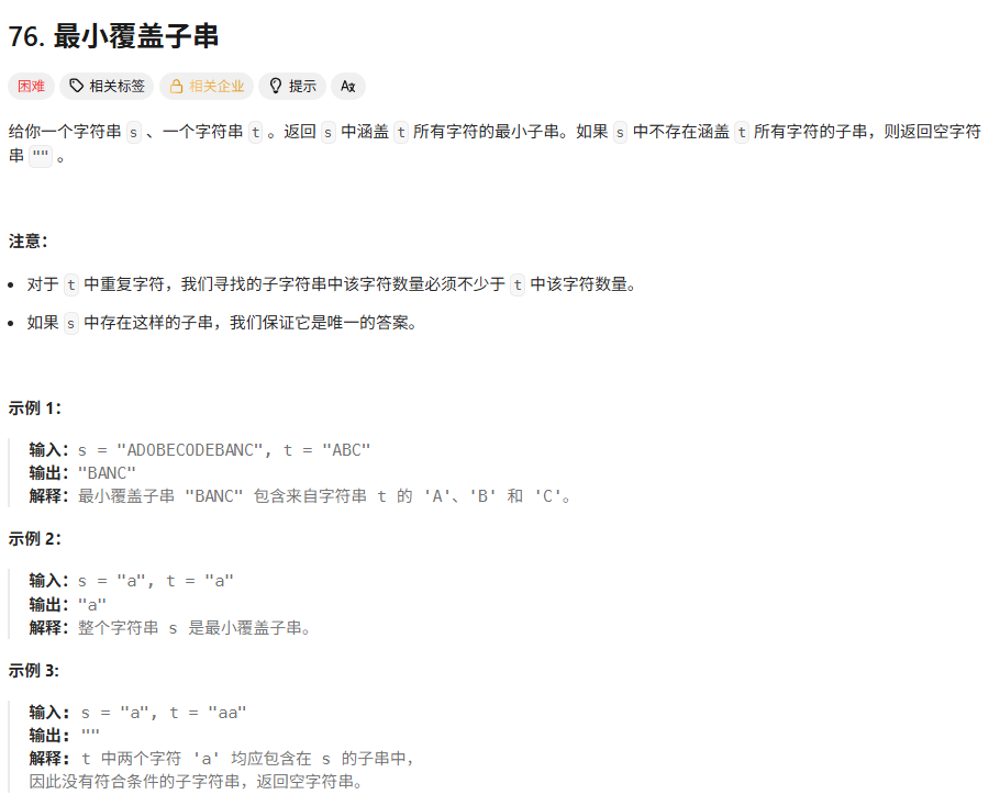 看了题解,没看代码,知道了题解的解题思路之后,想自己实现这个地方,但是一直报错,刚刚我发现了我是错在哪里了。题解思路是左右指针,当包含t中所有指针的时候,左指针右移,当不包含所有的时候,右指针右移。代码就体现这个,但我发现,一直报错,当不包含所有的时候,右指针右移的时候可能会有里面有的数据,我没有算,导致一直没有得到正确的结果。这道题我纠结的时间太久了,我决定不看了,直接看答案。