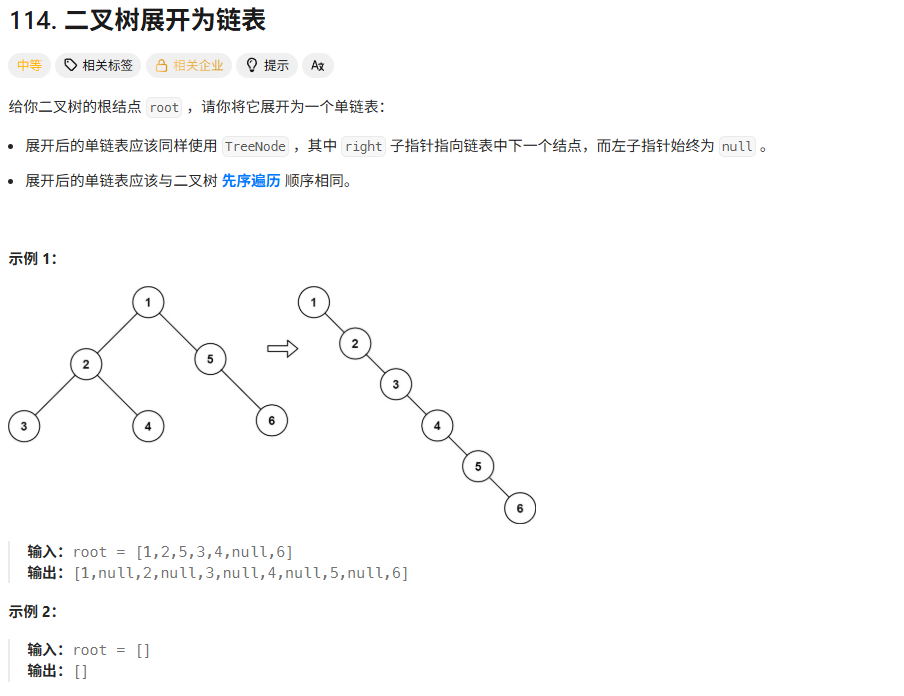 class Solution {public void flatten(TreeNode root) {List<TreeNode>list=new ArrayList();Deque<TreeNode>stack=new LinkedList();TreeNode p=root;while(!stack.isEmpty()||p!=null){while(p!=null){list.add(p);stack.push(p);p=p.left;}p=stack.pop(); p=p.right;}for(int i=1;i<list.size();i++){root.left=null;root.right=list.get(i);root=root.right;}}