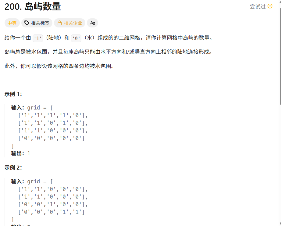 class Solution {public int numIslands(char[][] grid) {int count=0;int row=grid.length;int col=grid[0].length;for(int i=0;i<row;i++){for(int j=0;j<col;j++){boolean flag=false;//可加1的条件://为1,且为行第一或前一个不为1,且列第一或者上面一个不为1if(grid[i][j]=='1'&&(j==0||grid[i][j-1]!='1')&&(i==0||grid[i-1][j]=='0')&&(j!=col-1&&grid[i][j+1]=='0')){count++;flag=true;}}}return count;}