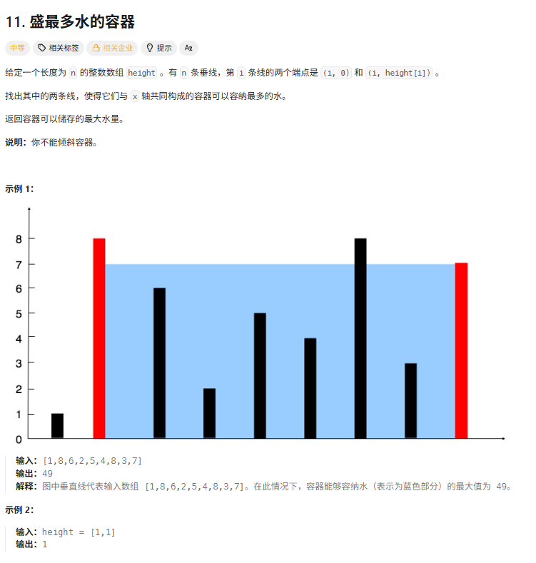 class Solution {public int maxArea(int[] height) {int n=height.length; int max=0;int[] allSize=new int[n];for(int i=n-1;i>=0;i--){for(int j=i+1;j<=n-1;j++){int h=Math.min(height[i],height[j]);int w=j-i;allSize[j]=h*w;}for(int p=0;p<n;p++){if(allSize[p]>max){max=allSize[p];}}}return max;}
