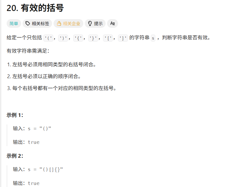 遍历字符串,如果是前括号,就入栈,如果是后括号,就和出栈的元素进行不比较,如果出现不一样的,返回false。注意可能先入栈的是后括号,这种栈会是空的,所以在判断的时候可以加上判断栈是否为空的这个东西来判断