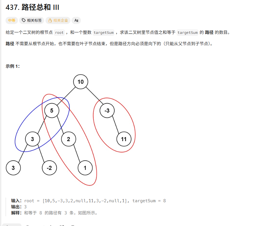 class Solution {public int pathSum(TreeNode root, int targetSum) {if(root==null)return 0;int r=sum(root,targetSum);r+=pathSum(root.left,targetSum);r+=pathSum(root.right,targetSum);return r;}public int sum(TreeNode root,long targetSum){if(root==null)return 0;int ret=0;int v=root.val;if(v==targetSum){ret++;}ret+=sum(root.left,targetSum-v);ret+=sum(root.right,targetSum-v);return ret;}