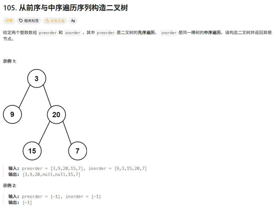 class Solution {Deque<Integer>stack=new LinkedList();public TreeNode buildTree(int[] preorder, int[] inorder) {return createtree(preorder,inorder,0,0,inorder.length-1);}public TreeNode createtree(int[] preorder, int[] inorder,int sp,int si,int ei){int n=inorder.length;if(ei==si){return new TreeNode(inorder[ei]);}if(si>ei)return null;//sp表示preorder中的开始。ei表示inorder中的结束TreeNode root=new TreeNode(preorder[sp]); //rp找相同的int rp=si; while(rp<n&&inorder[rp]!=preorder[sp])rp++;if(rp>si){TreeNode l=createtree(preorder,inorder,sp+1,si,rp-1);root.left=l;}if(rp<ei){TreeNode r=createtree(preorder,inorder,sp+(rp-si)+1,rp+1,ei);root.right=r;}return root;}