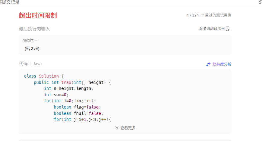 class Solution {public int trap(int[] height) {int n=height.length;int sum=0;for(int i=0;i<n;i++){ boolean flag=false; for(int j=i+1;j<n;j++){if(height[j]>height[i]){int b=0;for(int p=i+1;p<j;p++){b=b+height[p];}int area=height[i]*(j-i-1)-b;sum=sum+area;break;}}}return sum;}