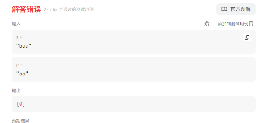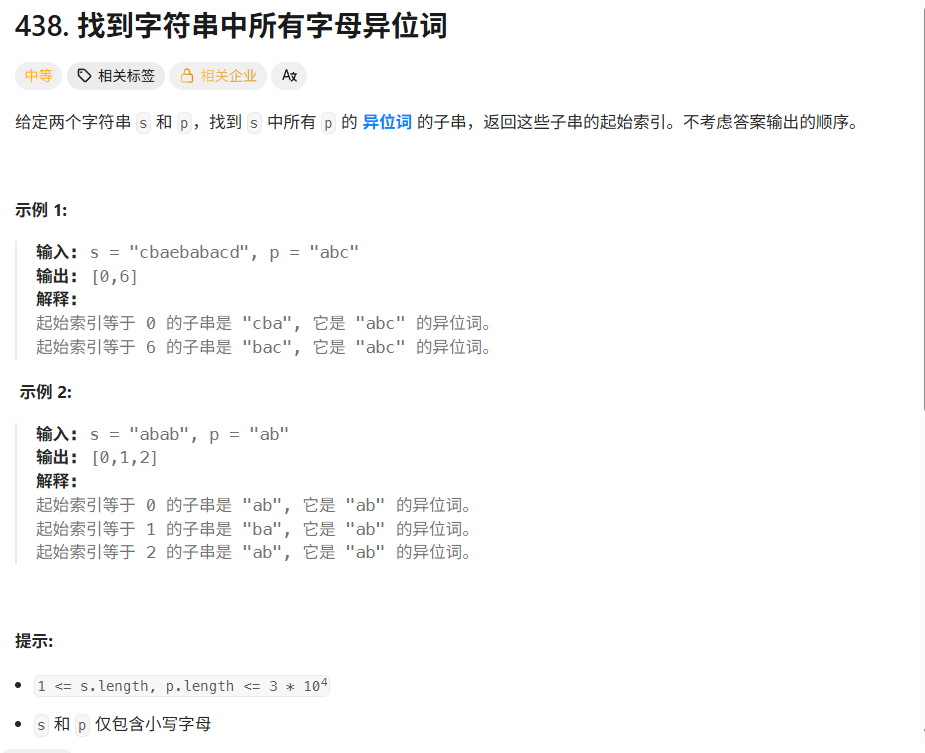 我的这个解法是在判断s和p是否一样的这个地方搞错了。我用的是哈希表,哈希表就无法通过这个p中有重复值的这种例子。然后在让AI帮我排错的时候,不小心将看到答案了,知道了另一种方法。