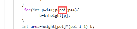 操作:找a后面最大的数字,算面积(方法和上面的一样)。遍历a后面的数字,找到最大的数字并记下他的下标,然后算面积。并且让a指针,直接指到下标的位置(在代码中采用i=poi-1是因为循环中会i++)这就是我的解法。