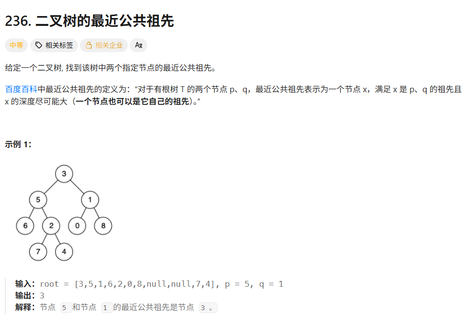 一个满足条件的节点,只有两种情况,左右子树分别包含p,q。或者此节点就是p或q另一个节点在他的左右子树上面。递归方法,检查节点状态,看是否满足上面的情况,满足返回答案,不满足,接着往下递归,返回值为,左子树包含pq的情况,右子树包含pq的情况,本节点和Pq的情况的一个交叉的反应情况。