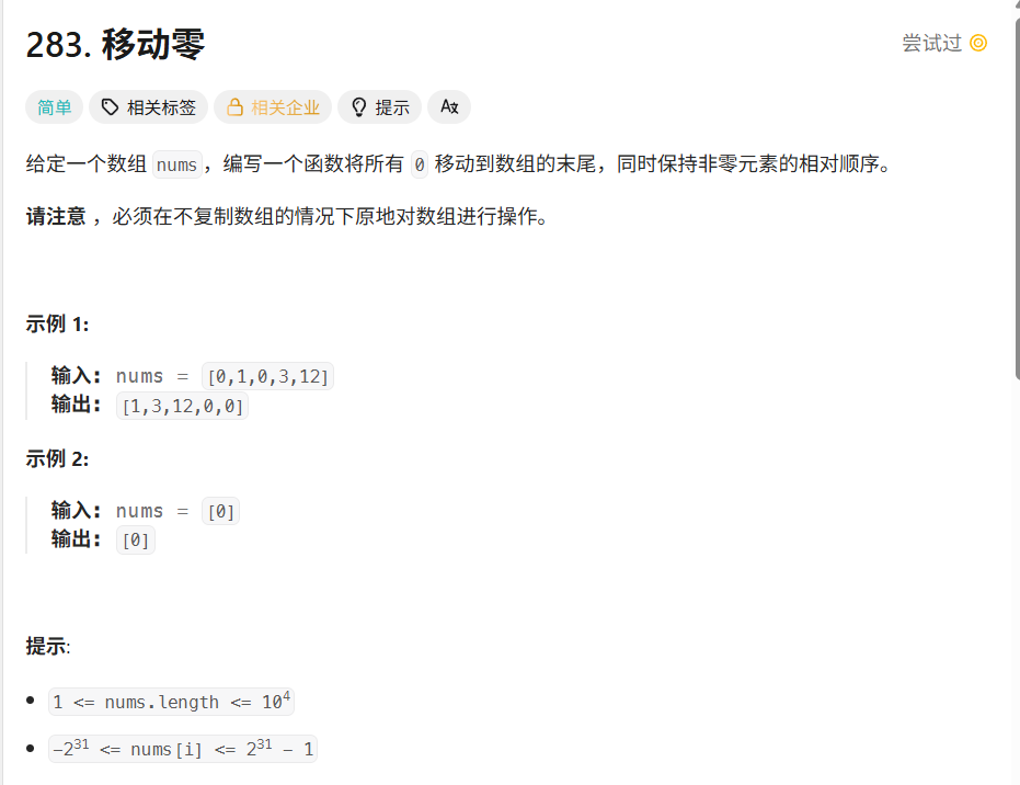 class Solution {public void moveZeroes(int[] nums) {int n=nums.length;int left=0;int right=0;while(right<n){if (nums[right]!=0) {int tmp = nums[left];nums[left] = nums[right];nums[right] = tmp;left++;}right++;}}