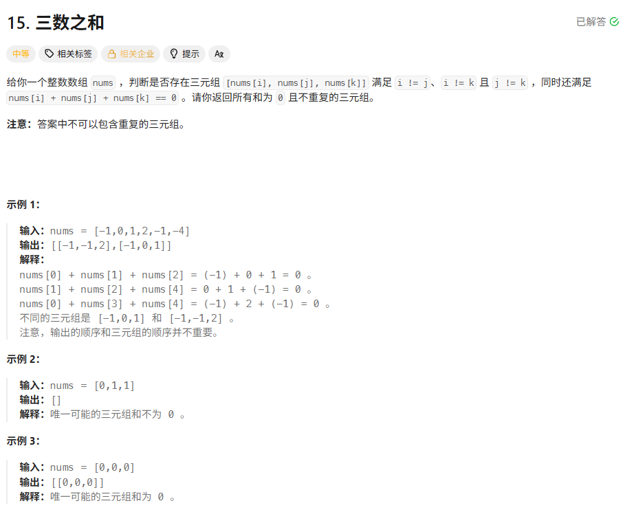 class Solution {public List<List<Integer>> threeSum(int[] nums) {Arrays.sort(nums);int n=nums.length;List<List<Integer>>arrs=new ArrayList<>();for (int i = 0; i < n; i++) {if (i==0||nums[i]!=nums[i-1]){int third=n-1;for (int j = i+1; j < n; j++) {if(j==i+1||nums[j]!=nums[j-1]){while(j<third&&nums[i]+nums[j]+nums[third]>0){third--;}if(j<third&&nums[i]+nums[j]+nums[third]==0){List<Integer>arr=new ArrayList<>();Collections.addAll(arr,nums[i],nums[j],nums[third]);arrs.add(arr);}}}}}return arrs;}}