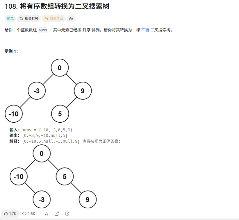 class Solution {public TreeNode sortedArrayToBST(int[] nums) {int n=nums.length;return balance(nums,0,n-1);}public TreeNode balance(int []nums,int start,int end){int mid=(start+end)/2;if(start>end){return null;}TreeNode l= balance(nums,start,mid-1);TreeNode r=balance(nums,mid+1,end);TreeNode m=new TreeNode(nums[mid],l,r);return m;}