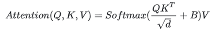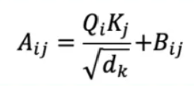 以单个token的计算为例,Qi和Kj分别为token i 和token j的“query”值和“key”值,dk是“key”向量的维度,Bij是相对位置j−i的偏置。