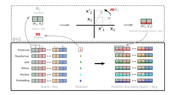 如果将二维旋转矩阵上乘以一个向量,那么它改变了向量的角度,并保持了向量的长度。将旋转矩阵乘以key和query向量。