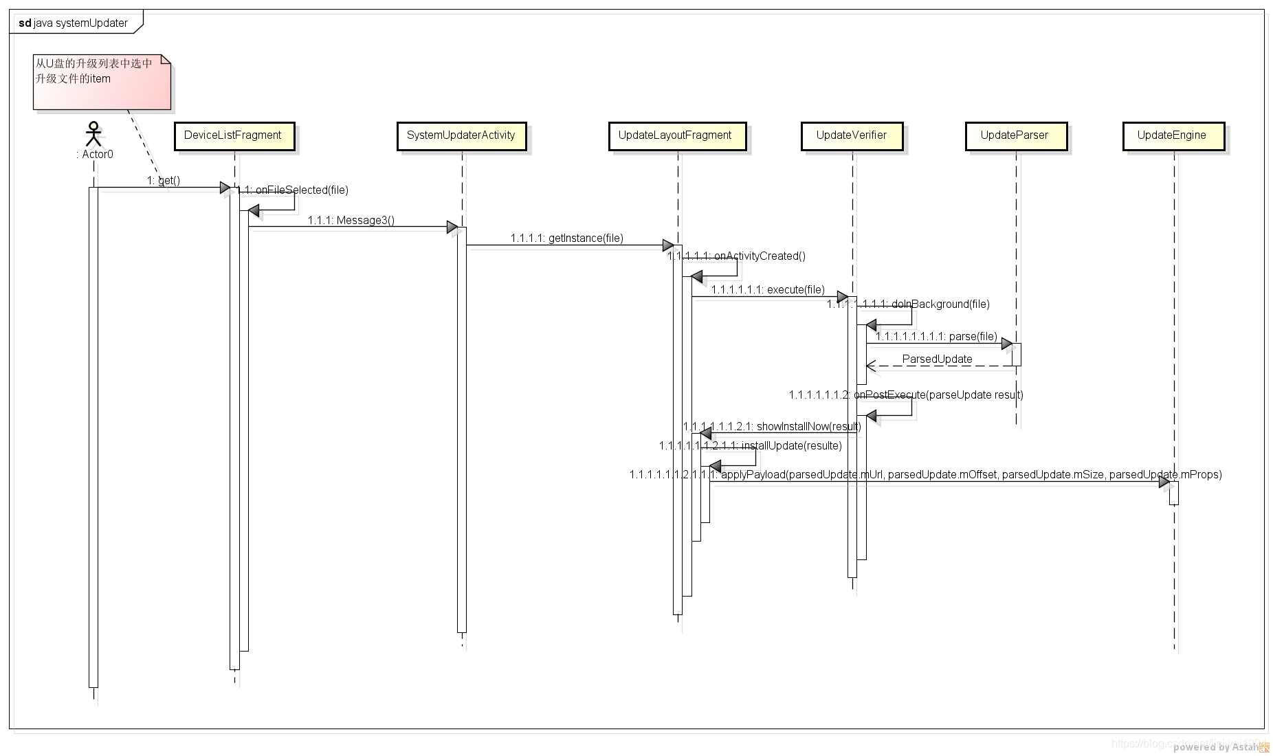 //尝试验证更新并提取安装所需的信息private class UpdateVerifier extends AsyncTask<File, Void, UpdateParser.ParsedUpdate> {@Overrideprotected UpdateParser.ParsedUpdate doInBackground(File... files) {Preconditions.checkArgument(files.length > 0, "No file specified");File file = files[0];try {//调用UpdateParser.java的parse解析升级包文件return UpdateParser.parse(file);} catch (IOException e) {Log.e(TAG, String.format("For file %s", file), e);return null;}}@Overrideprotected void onPostExecute(UpdateParser.ParsedUpdate result) {mProgressBar.setVisibility(View.GONE);if (result == null) {showStatus(R.string.verify_failure);return;}if (!result.isValid()) {showStatus(R.string.verify_failure);Log.e(TAG, String.format("Failed verification %s", result));return;}if (Log.isLoggable(TAG, Log.INFO)) {Log.i(TAG, result.toString());}//调用installUpdate,然后调用mUpdateEngine.applyPayload传入升级所需要的url,偏移量,大小等开始升级showInstallNow(result);}}