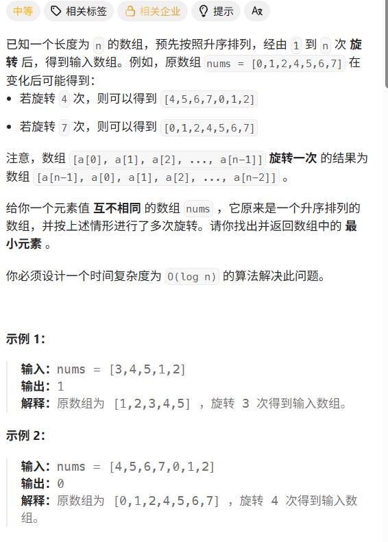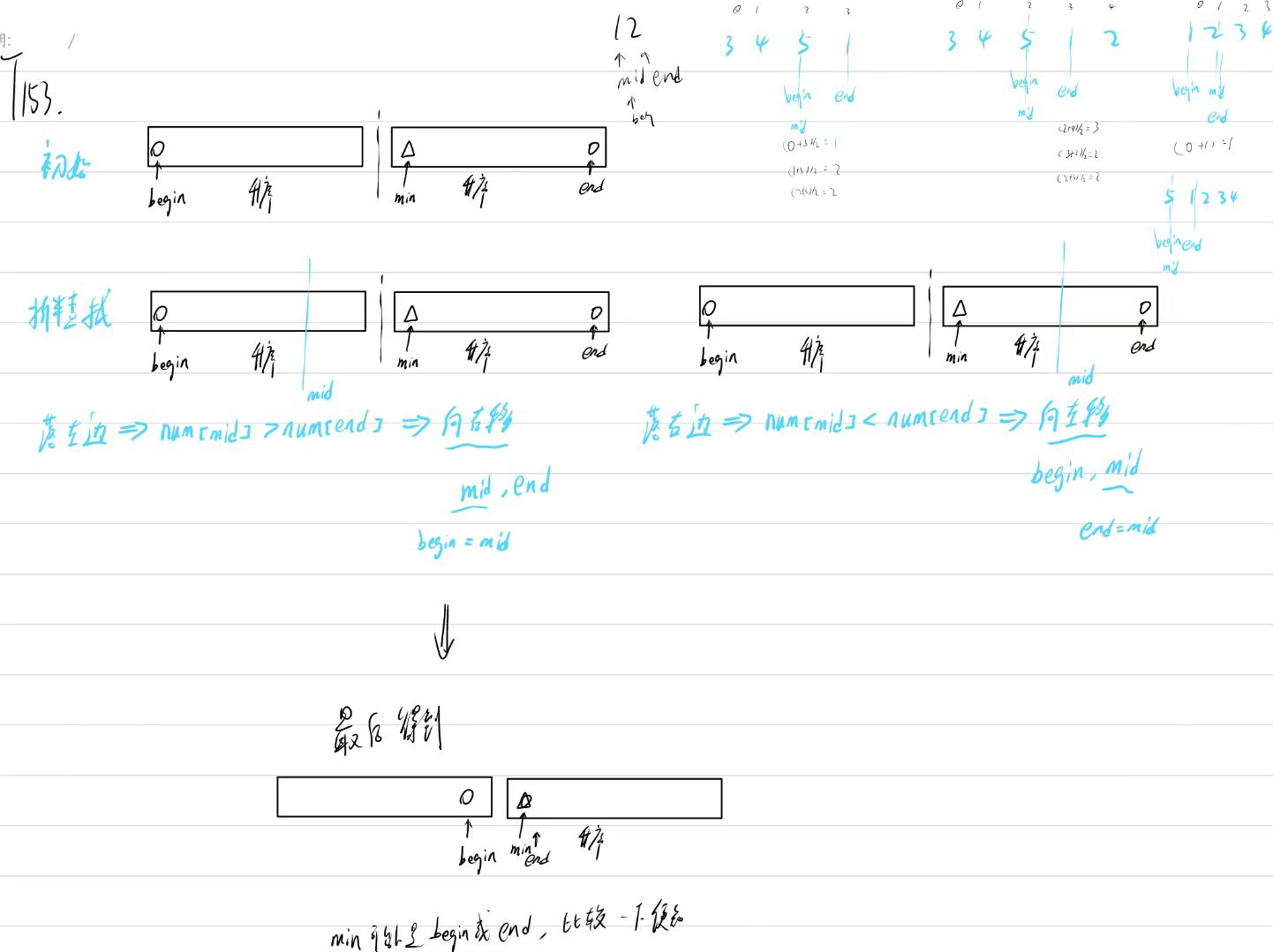 class Solution {public int findMin(int[] nums) {if(nums.length == 1)return nums[0];int begin = 0;int end = nums.length - 1;int mid = (begin + end) / 2;if(nums[begin] <= nums[end]) //本就是升序return nums[begin];while(begin < end - 1){mid = (begin + end) / 2;if(nums[mid] > nums[begin] && nums[mid] > nums[end]) //落到左边begin = mid;if(nums[mid] < nums[begin] && nums[mid] < nums[end]) //落到右边end = mid;}if(nums[begin] > nums[end])return nums[end];elsereturn nums[begin];}