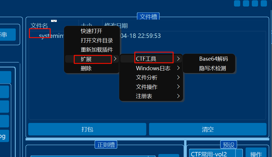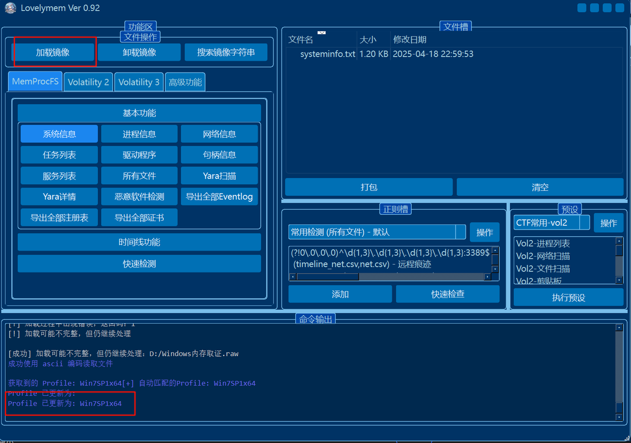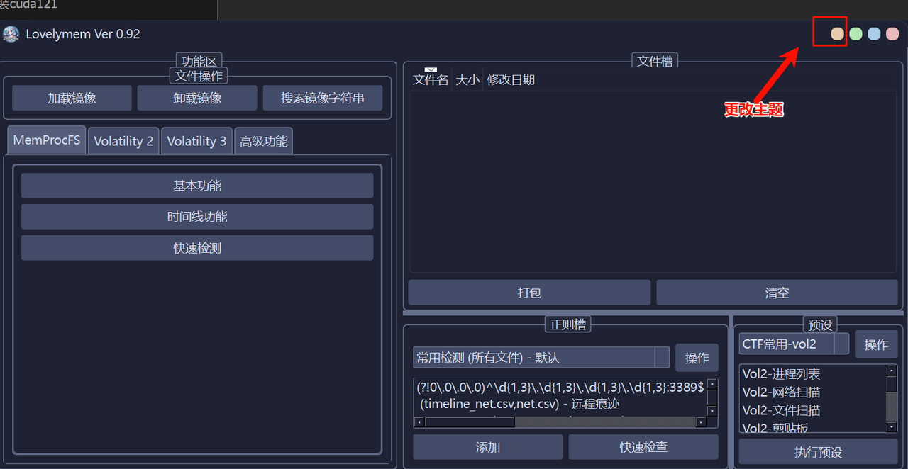 LovelyMem 操作界面说明界面布局:左侧功能槽:集成了常见的三个内存取证工具,用户可以方便地选择并进行操作。右侧上方文件槽:用于展示已导出的文件,且与软件目录下的 output 文件夹相对应。此区域方便用户查看导出的分析结果和数据。右侧下方正则槽:提供了自定义正则表达式的功能,用户可以编辑和使用正则表达式快速检查一些常见的导出文件,进行灵活的数据筛选和分析。预设槽:用于快速执行一些常见命令,通过多线程并行处理加快取证过程。右上角按钮(从左到右):更换主题:允许用户切换软件界面主题,定制更符合个人喜好的界面风格。最小化:将软件窗口最小化,暂时隐藏在任务栏。最大化:将软件窗口扩展至全屏显示,方便查看所有操作内容。关闭退出:关闭软件并退出程序