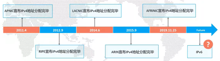 2011年2月3日,IANA(internet assigned numbers authority,因特网地址分配组织)宣布将其最后的468万个地址平均分配到全球5个RIR(regional internet registry,区域互联网注册管理机构),此后iana在没有可分配的ipv4地址。