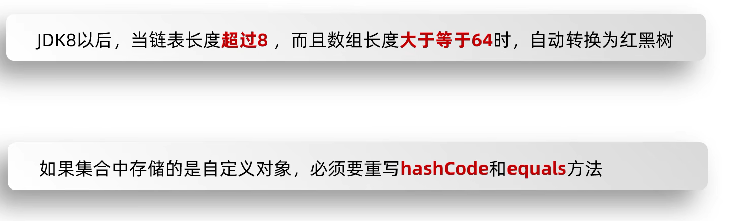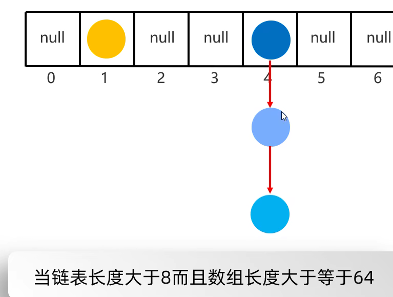 如果链表长度大于8而且数组长度大于等于64,存入的方式自动变成红黑树,提高效率