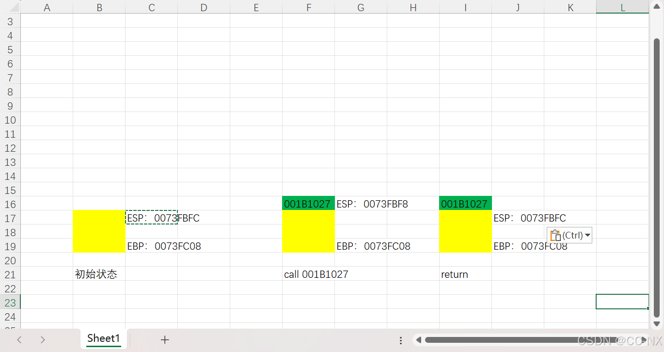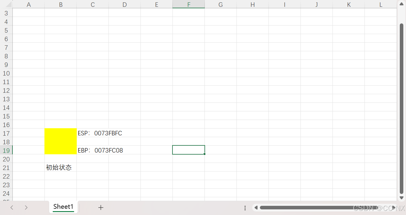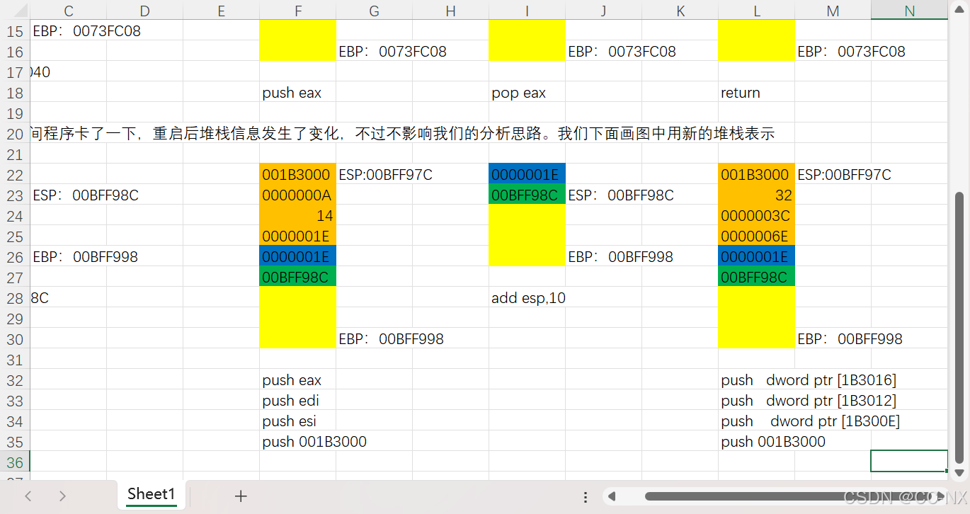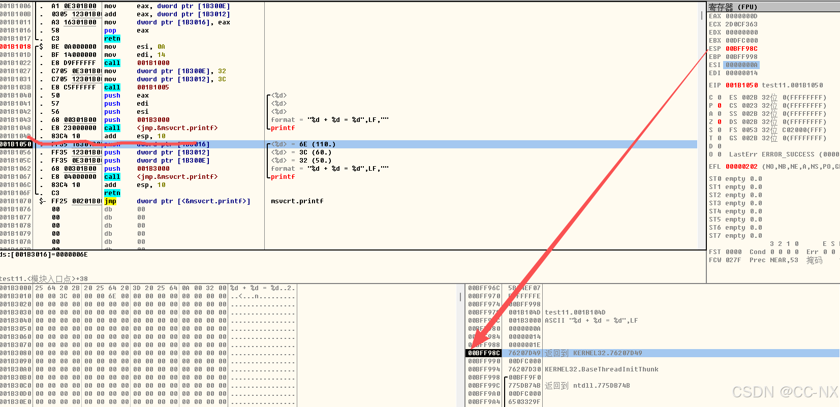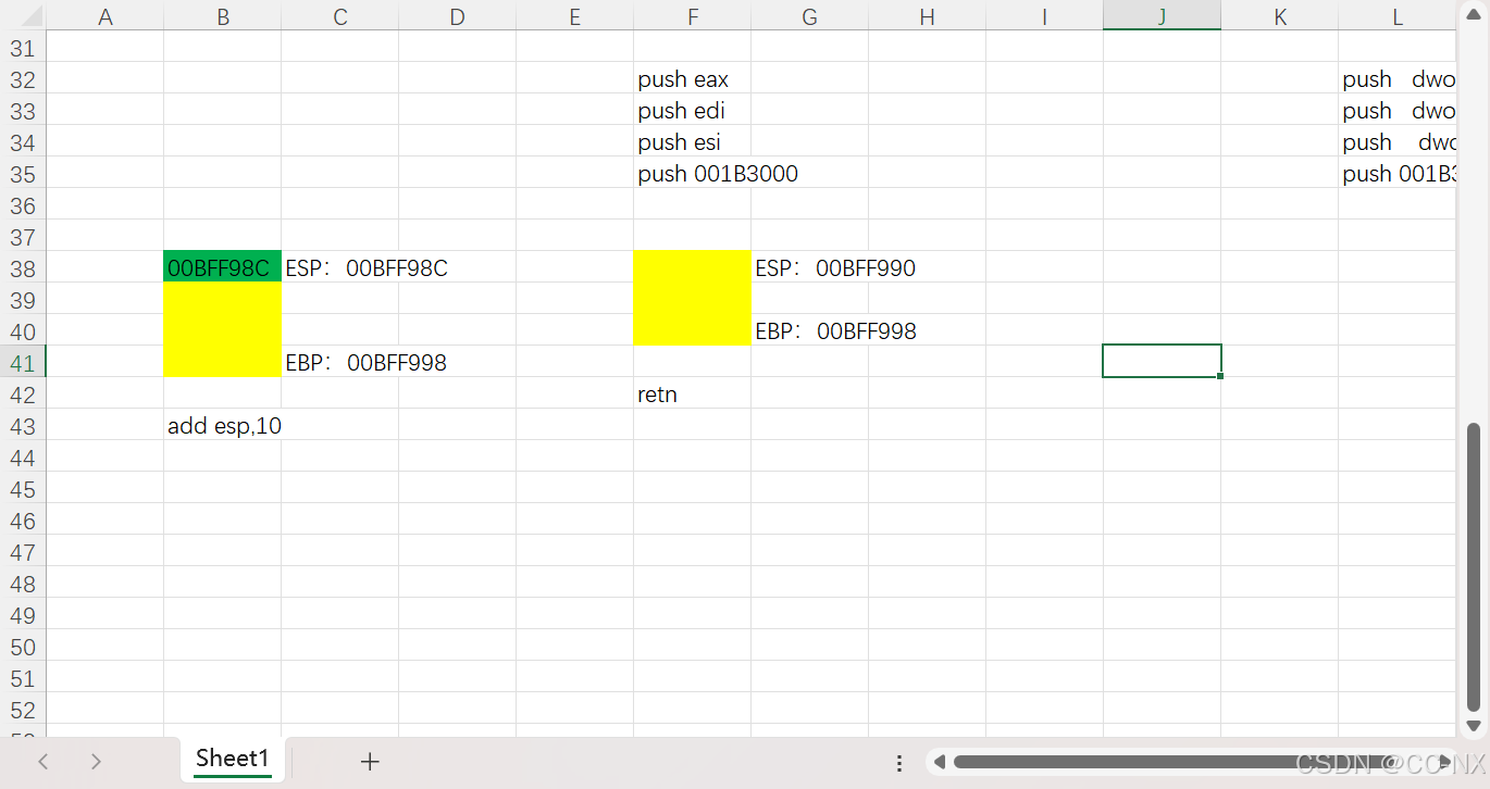 同理add esp,10,堆栈指针回到初始位置,栈顶数据被标记为"已释放"。