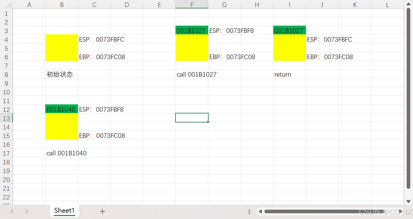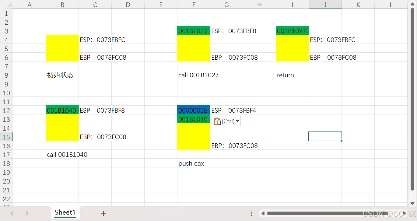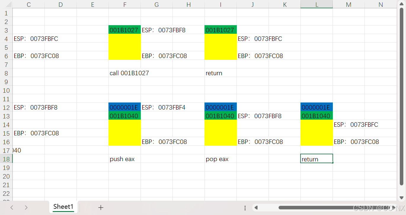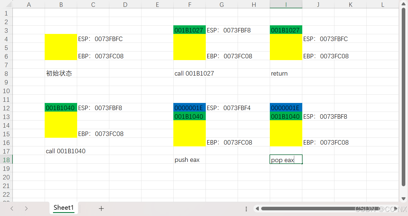 调用前: ESP = 1000 call指令: ESP = 1000-4 = 0FFC, [0FFC]=返回地址 push: ESP = 0FFC-4 = 0FF8 pop: ESP = 0FF8+4 = 0FFC ret: ESP = 0FFC+4 = 1000